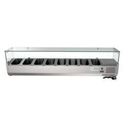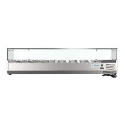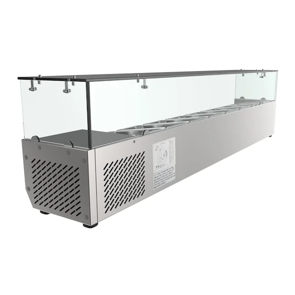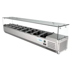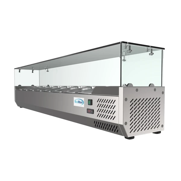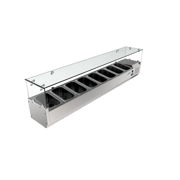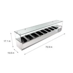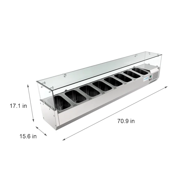 This 71 inch, eight- pan, countertop prep rail is a perfect solution for establishments with limited space. Keep essential prep items at hand and ensure that they are kept at the appropriate temperature. The double pane tempered glass food guard gives you the option to use this as a self-serve salad bar or sandwich station and will keep the items inside sanitary. Built with smooth and durable stainless steel that will stand up to the high-volume commercial kitchen environment, retain an attractive finish and is easy to clean. Includes eight removable stainless-steel food pans for easy cleaning, fill the pans with salad, ice cream, and sundae toppings or pizza and sandwich ingredients, each pan is 10.4 in. L x 6.4 in. W. The front digital temperature display makes the temperature easy to monitor, automatic defrost feature, and a digital temperature control ensure consistent temperature, temperature range 32°F to 53°F.