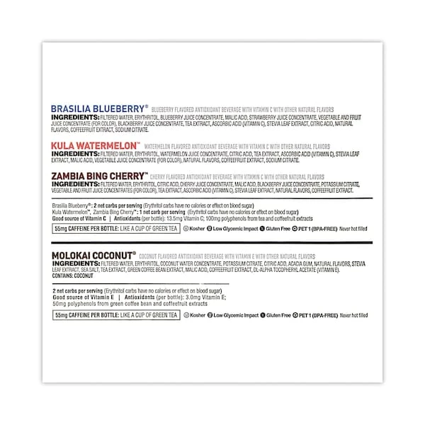 | Beverage Flavor | Brasilia Blueberry; Kula Watermelon; Molokai Coconut; Zambia Bing Cherry |