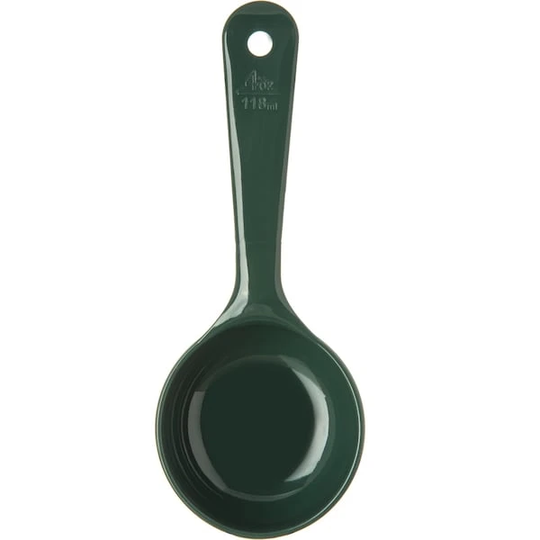 Portion Control Spoon, Capacity 4 oz, Perforated/Solid Solid, Overall Length 8 1/4 in, Color Green, Bowl Material Acetal, Bowl Length 1 3/8 in, Bowl Width 3 1/4 in, Coated Handle No, Handle Material Acetal, Product Type Short Handle Measure Miser, NSF Certified Yes, Package Quantity 12