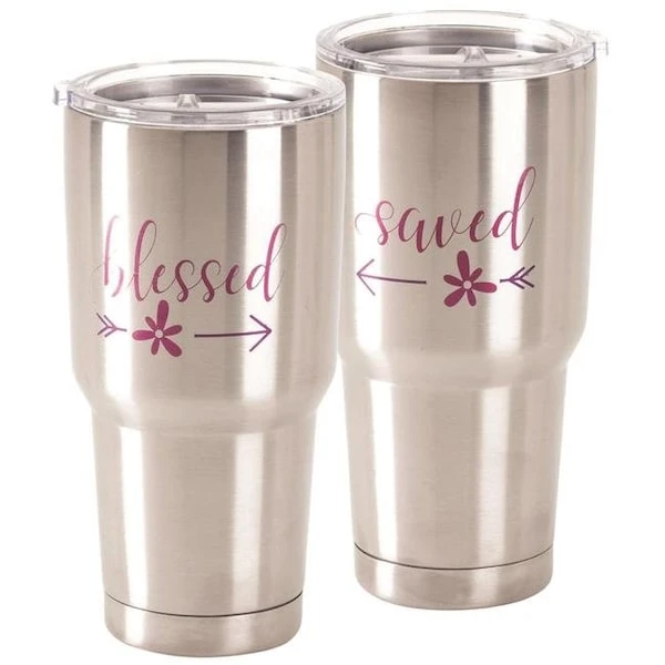 Blessed Large 30 oz Stainless Steel Tumbler with Lid. This inspirational tumbler keeps you going all day – If your favorite beverage is hot it stays hot; if it’s cold it stays cold. Generous 30 oz size tumbler is stainless steel inside and out. Attractively arranged one-color design. Sturdy; plastic lid has slide closure and is clear to let you quickly see when it’s time to refill! Tumbler is 8″ high and 4″ diameter at top.