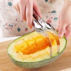 This convenient watermelon slicing tool helps carve watermelons quickly, efficiently, and doubles as a serverHighlightsWatermelon Slicer/Server 1-, or 2-PackFeatures an ergonomic rubberized handleCurved bladesMaterial: stainless steelDishwasher-safe designDimensions: 11inH x 4inW x 1.5inL