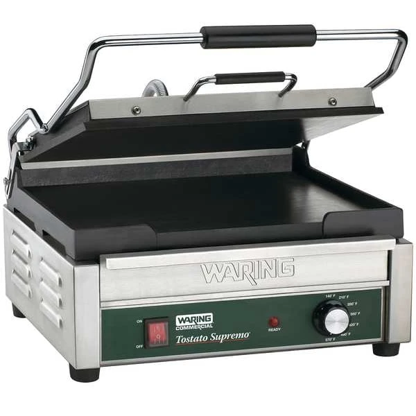 Toasting Grill, Plate Design Flat, Plate Material Cast Iron, Cooking Surface Depth 11 in, Cooking Surface Width 14 1/2 in, Overall Height 23 in, Overall Width 21 3/4 in, Overall Depth 20 3/4 in, Voltage 120V AC, Wattage 1,800 W, Maximum Operating Temperature 570 Degrees F, Current 15 A, Features Adjustable Back Feet, Auto Balancing Top Plate to Handle Foods Up to 3 in Thick, Heat-Resistant Handles, Limited 1 Year Warranty, Power In.ON In. and In.READY In. Indicator Light