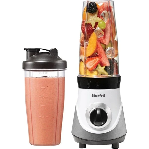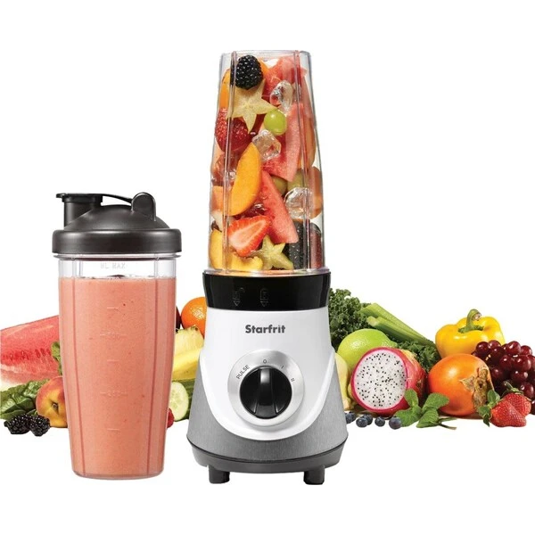 The Starfrit Personal Blender makes integrating produce into your diet a breeze. Operable at 3 different speeds-high, low and pulse control-the blender is specifically designed for convenience and user-friendliness. It comes with 2 custom-made blades: the blending blade crushes ice into snow in seconds, ideal for frozen shakes and smoothies. while the the grinding blade can quickly and easily process coffee beans, nuts and spices.