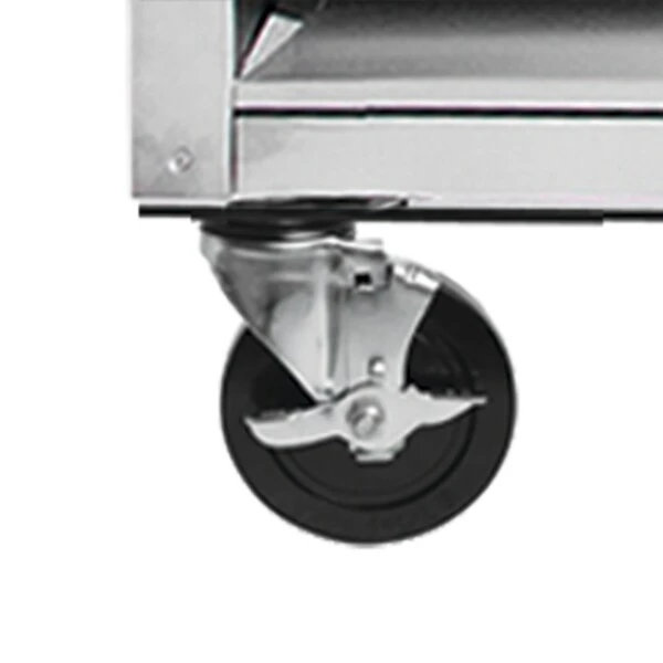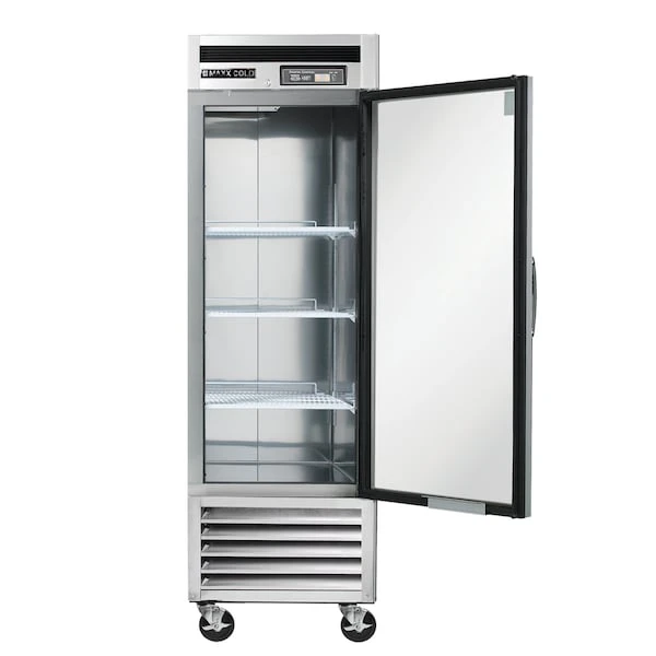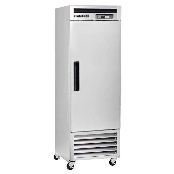 The Maxx Cold Single Door Commercial Reach-In Refrigerator is a one-section refrigerator with one solid hinged door. The unit has a storage capacity of 23 cu. ft., three wire shelves, interior light, digital temperature control, automatic defrost, and a stainless steel interior and exterior. It also comes with four 4″ swivel casters and a bottom-mount 1/3 HP compressor.