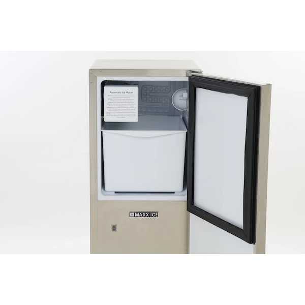 Shallow Depth Outdoor Built-In Undercounter Ice Maker, 15, 25 lbs, Crescent Ice Cubes, 22 lb Ice Storage Bin, in Stainless Steel