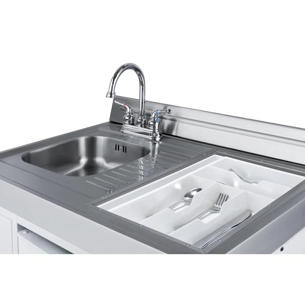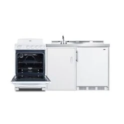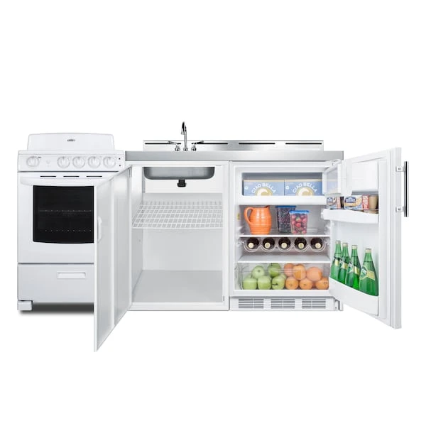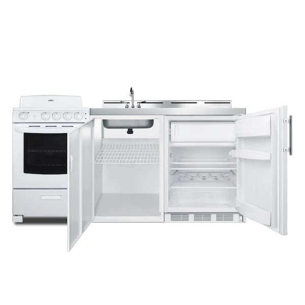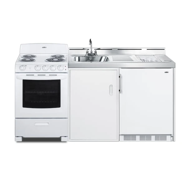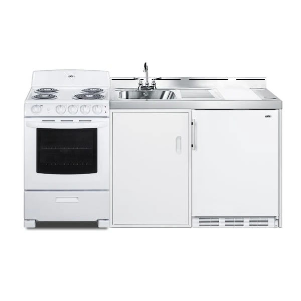 Summit’s line of all-in-one combination kitchenettes brings complete kitchen convenience in a slim-fitting design. These units come fully featured with everything you need for the home foodservice experience, including a refrigerator with a freezer compartment, 4-element electric coil cooktop with oven, sink with faucet, cutlery bin with a removable cutting board cover, and storage cabinet for dry goods. The ACK72COILW is a 72″ wide kitchenette with an easy-fitting 24″ depth. This unit comes with a stainless steel countertop offering durability in a professional look. The surface includes a small cutlery bin, with a removable cutting board cover to ensure easy food prep. The compact sink features a ready-to-use faucet. Underneath the sink is a large cabinet with a removable shelf for added storage convenience.Unlike many other brands’ kitchenettes, all Summit units include a refrigerator with a freezer compartment to cover all of your cold storage needs. The ACK72COILW includes the CT661W, with 5.1 cu.ft. of storage space. A dual evaporator system separately cools the auto defrost refrigerator section and manual defrost freezer compartment for improved overall performance. This model includes adjustable glass shelves, door storage, a scalloped wine shelf, and crisper. The ACK72COILW also ships with Summit RE2411W, a 24″ wide 220V electric range complete with a 4-element coil cooking surface, and a full oven compartment with a bake and broil function. This range includes sensors on each element that cycle off if the temperature nears flashpoint for safer cooking, adjustable oven racks, indicator lights that illuminate when the elements and oven are in use, and a storage drawer for added convenience. The range can be installed on the left or right side of the kitchenette. The ACK72COILW is shipped on one pallet, with the kitchenette and refrigerator fully assembled and the range packaged separately. Perfect for studio apartments, hotel rooms, dormitories, assisted living facilities, temporary kitchen facilities, and any other location in need of a low maintenance, fully-featured compact kitchenette.