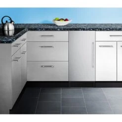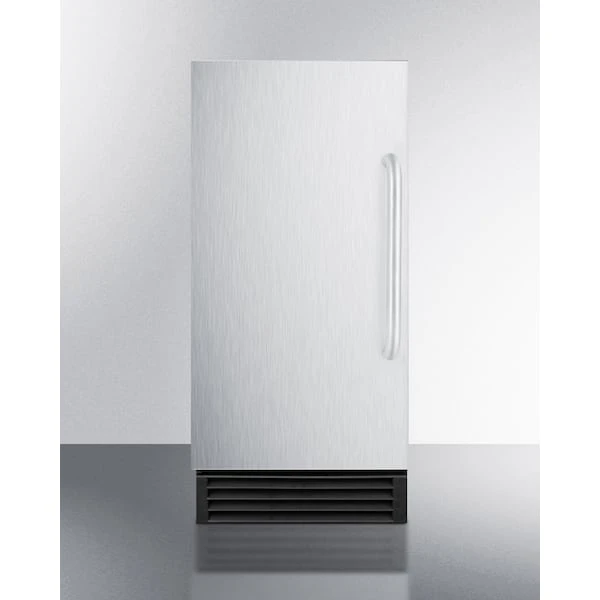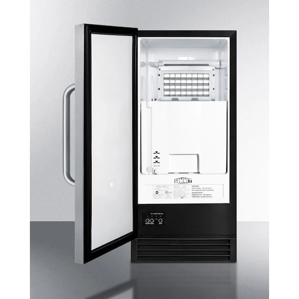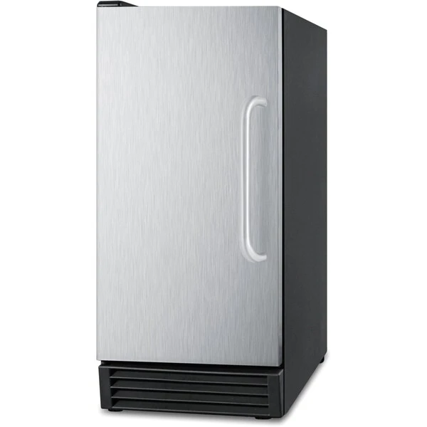 15″ wide built-in undercounter NSF-listed clear icemaker with automatic defrost and internal pumpSUMMIT BIM44G is an auto defrost clear icemaker designed for true convenience in operation and placement.Automatic defrost makes maintenance simple and stress-free, while the BIM44G’s front-breathing cooling system and fully finished sides allow built-in or freestanding use. A 15 inch width makes it ideal for any tight location. This model now comes equipped with an internal pump.The BIM44G can make up to 50 pounds of clear cube-shaped ice, with an adjustable bin capacity that can temporarily hold up to 25 pounds. The ice is produced in sheets and can be easily broken into cubes using the provided scoop.The BIM44G has a jet black cabinet with user-reversible stainless steel door (LHD is default door swing; specify upon ordering for RHD). A curved towel bar handle in brushed stainless steel is included.This unit is NSF listed for use in commercial establishments and is ENERGY STAR certified for commercial use. Commercial ENERGY STAR certification Flexible design allows built-in or freestanding useAutomatic defrost saves on user maintenanceSlim 15″ width is perfect for wet barsStainless steel door includes professional handle Product Dimensions & Specifications:Height of Cabinet: 33.0″ (84 cm)Width: 14.5″ (37 cm)Depth: 23.5″ (60 cm)Weight: 100.0 lbs. (45 kg)Capacity: US Electrical Saftey: ULAmps: 4.8Voltage Frequency: 115 V AC/60 Hz