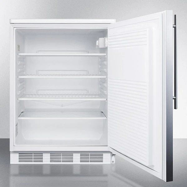 Summit built-in undercounter all-refrigerator with lock, stainless steel door, thin, vertical handle summit’s commercially approved ff7lbisshv is one of the industry’s most trusted undercounter all-refrigerators, with dimensions that fit and construction that lasts. With a width just under 24 inches, the ff7lbisshv is perfect for any tight space. Designed for built-in or freestanding use, this unit has a white cabinet and fully wrapped stainless steel door. A sleek stainless steel handle set vertically across the door completes the elegant look, with a front-mounted lock installed for added security. Inside, the ff7lbisshv uses automatic defrost to lower user maintenance. Summit’s unique “hidden” evaporator is set behind the rear wall, creating a seamless interior that’s easy to clean with no tricky crevices to trap food. The generous storage capacity and flat door liner can accommodate large trays with dimensions of 19 1/2″ x 16.” adjustable shelves are included. A rocker switch to turn the interior light on and off is located just behind the adjustable thermostat for additional convenience. User-friendly and energy efficient, the ff7lbisshv fits well in any commercial, home, or medical setting. Match it with any frost-free scff55 freezer for a complete side-by-side set.