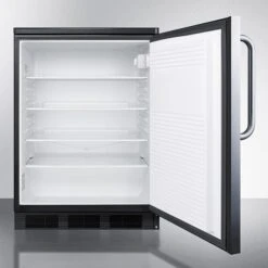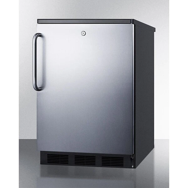 Summit commercial undercounter refrigerator, front lock summit’s ff7lblsstb is a commercially listed freestanding, all refrigerator for general purpose use. It has auto defrost which minimizes user maintenance. Ideal 24″ footprint offers full 5.5 cu. Ft. Storage capacity in a slim fit. Comes with a stainless steel wrapped door including a professional towel bar handle. Keyed lock for secure interior. It is energy star certified .