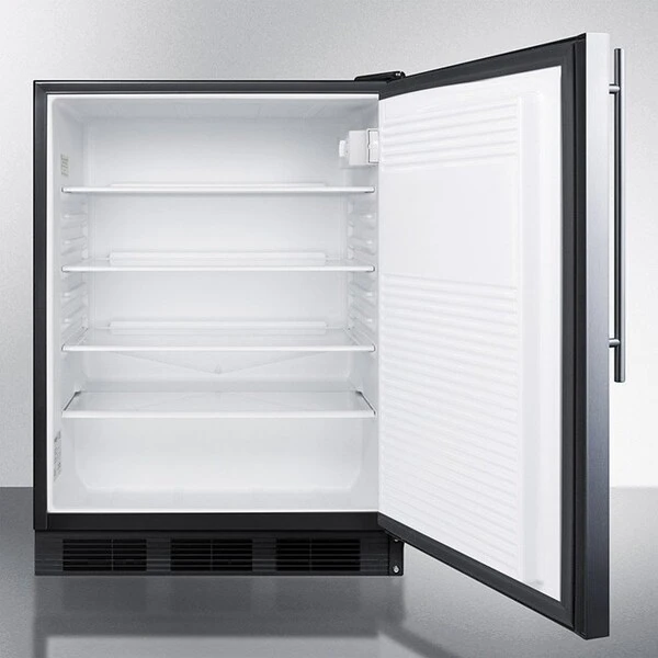 Summit freestanding all-refrigerator with stainless steel door, thin, vertical handle summit’s commercially approved ff7bsshv is one of the industry’s most trusted counter height all-refrigerators, with dimensions that fit and construction that lasts. With a width just under 24 inches, the ff7bsshv is perfect for any tight space. Designed for freestanding use, this unit has a black cabinet and fully wrapped stainless steel door. A sleek stainless steel handle set vertically across the door completes the elegant look. Inside, the ff7bsshv uses automatic defrost to lower user maintenance. Summit’s unique “hidden” evaporator is set behind the rear wall, creating a seamless interior that’s easy to clean with no tricky crevices to trap food. The generous storage capacity and flat door liner can accommodate large trays with dimensions of 19 1/2″ x 16.” adjustable glass shelves are included. A rocker switch to turn the interior light on and off is located just behind the adjustable thermostat for additional convenience. User-friendly and energy efficient, the ff7bsshv fits well in any commercial, home, or medical setting. Match it with any frost-free scff55 freezer for a complete side-by-side set.