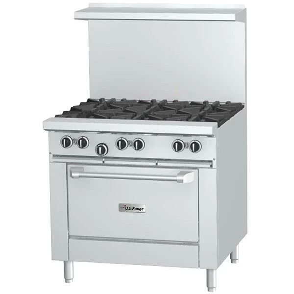 The U.S. Range U36-6R natural gas six burner range comes packed with features that enhance its convenience and usability. Six powerful 32000 BTU two-piece cast iron burners are set in split ergonomic grates.The standard oven features a robust 38000 BTU inHin style cast iron burner and a nickel-plated oven rack with a 3-position removable guide. Plus its porcelain bottom and door liner makes cleanup a snap and its 26 1/4in width fits standard sheet pans in both directions.The U36-6R features an easy-to-modulate snap action oven thermostat with a temperature range from low to 500 degrees Fahrenheit. This wide temperature range with precision adjustment means you can use the oven for holding as well!The U.S. Range U36-6R is easy to clean and durable thanks to its stainless steel front and sides. With a large 27in deep work top surface and a 5in stainless steel plate rail you’ll have plenty of room to work.Overall Dimensions:Left to Right: 35 7/16inFront to Back: 34 1/2inCooking Surface Height: 36inHeight including back guard: 57inOven Dimensions:Left to Right: 26 1/4inFront to Back: 26inHeight: 13in