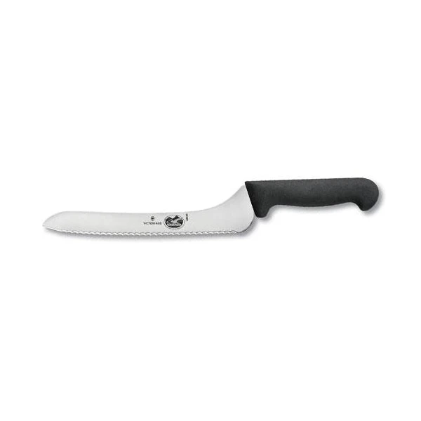 Bread knife; 9 in offset serrated blade; High carbon stainless steel; Stamped construction; Black Fibrox® handle is slip resistant when wet; NSF certified; Product formerly known as 40550